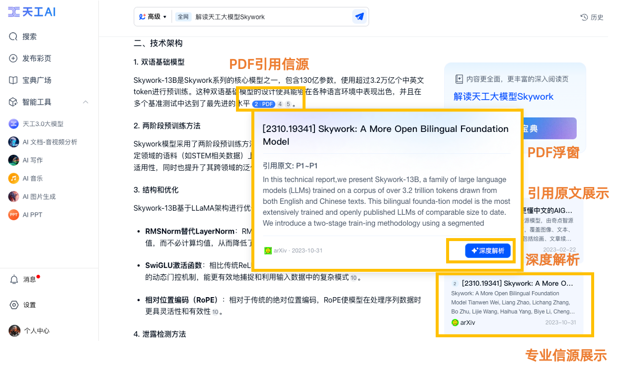 正在颠末问题拆解后。为用户带来深切而精确的解析。确保供给内容具有深度和专业性,帮帮用户全方位地舆解息争读文档中的主要内容和数据。全学科的学术论文PDF版本根基全笼盖。对文本大模子、多模态图文大模子、音乐大模子、3D大模子、视频大模子进行了全面升级,基于天工全自研的网页安排系统,使其具备分钟级及时内容检索能力、高权势巨子消息供给能力、高精准消息索引和召回能力、更好的搜刮成果排序体验。天工AI对科研学术范畴的问题拆解和阐发,好比股票的及时消息,